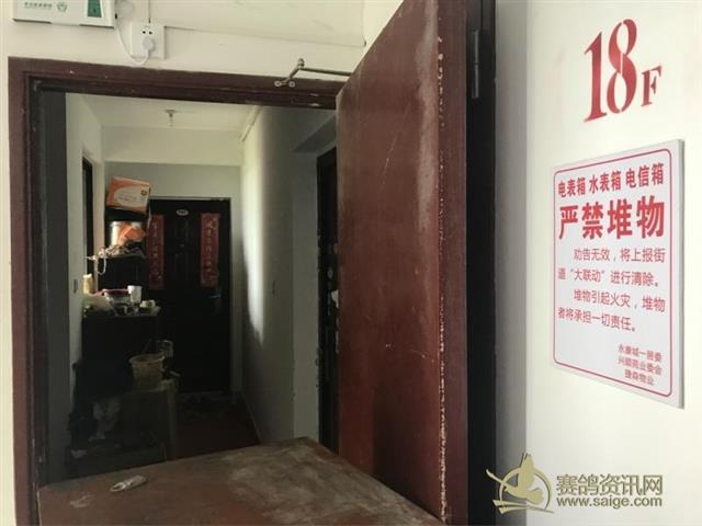 再回到12号楼,从18层一出电梯,记者便闻到浓重的臭味,很容易就锁定了孙老伯家;但眼前1米多宽的通道硬生生地被一个木制矮柜挡住去路。移开柜子后,孙老伯家门前通道上还有各类工具箱、喂食设备和生活杂物,整整占据了通道一半多的面积,不少物件上沾满了鸽粪等污渍。