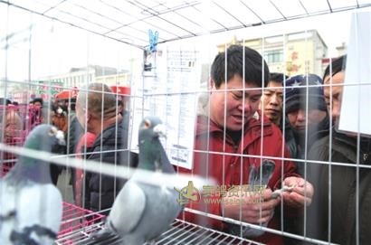 2月12日,农历正月初八,早晨还不到5点,老徐将一车爱鸽拉到了平原县恩城镇滨河公园沿街集市上,找了一个较好的位置,摆起了摊,参加这一年一度的初八鸽子节商品交易大会。此时,在红运村的这条长约5000米的集市上,各种各样的鸽子早已经占据了有利位置。来自内蒙、江苏、北京、天津等全国多个城市,操着不同口音的人群也早已经来到这里等候交易。
