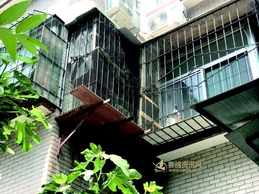 东方花园小区一位二楼业主在自家阳台上搭建鸽笼养鸽子。