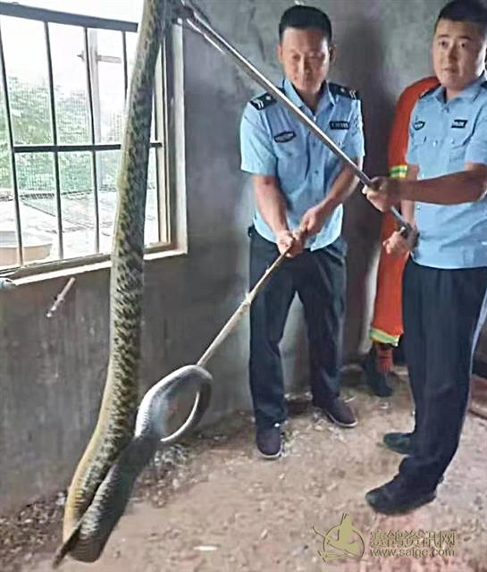 大蛇藏身鸽笼独享“霸王餐”,消防员擒获送客归山 炎炎夏日,野生动物的活动频繁。8月6日7时许,宿州市萧县永堌镇石庄村山上的一户居民家中内惊现一条大蛇。辖区消防大队接到报警后,立即赶赴现场实施处置。 救援人员刚刚到达山脚下,远远的看到一名男子向队员们招手示意,救援人员立即跟随该名男子来到半山腰的一户居民家中,看到一名70岁左右老汉正盯在家中鸽笼的入口,原来一条大蛇正盘踞在鸽笼的尽头。经过观察,这条大蛇长约2米,小臂粗细,嘴里吐着信子,不时发出“嘶嘶”的声音,并摆出一副随时准备攻击的架势。根据大蛇体表花纹,救援人员确定其为一条“王锦蛇”,俗称“菜花蛇”。 随即,救援人员对鸽笼出口进行封锁,防止菜花蛇受惊逃窜,同时使用捕蛇器,准备对菜花蛇进行抓捕。救援人员小心翼翼地接近菜花蛇,在其未警觉之时迅速使用捕蛇器夹住蛇头。此时菜花蛇疯狂地扭动着身躯试图逃脱,救援人员死死夹住蛇头拖动其身体,将其装入事先准备好的口袋中,并顺势扎紧袋口将其控制。最后,救援人员又驱车赶至偏远的山林处,将抓获的菜花蛇予以放生。 “我一个人住在这山上养了一些鸽子,这几天总是感觉鸽子在减少。今天打扫鸽笼卫生的时候突然发现竟然有条大蛇藏在鸽笼里边,我赶紧堵住鸽笼门,让儿子报警请你们来处理”刘老汉说到。 救援人员在此提醒广大群众:野生动物天性凶猛攻击性很强,不建议私自处置。如遇野生动物误入家中,应该立即拨打119报警电话,或者请有经验的专业人士来处理。(李亚 杨亚 记者 吴洋)