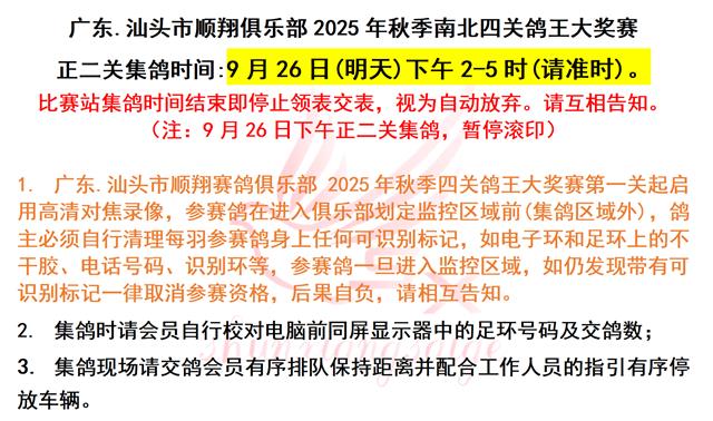 广东.汕头市顺翔俱乐部2025年秋季南北四关鸽王大奖赛正二关集鸽时间:9月26日(明天)下午2-5时(请准时)。(注:9月26日下午正二关集鸽,暂停滚印)