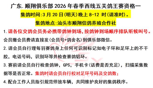 广东.顺翔俱乐部2026年春季西线五关鸽王赛资格一,集鸽时间为:3月20日(明天)晚上8-12 时(请准时)。