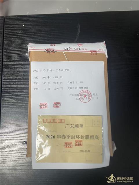 广东汕头市顺翔俱乐部2026年春季西线五关鸽王赛资格一明细 上笼:2782羽 常规赛6单关1(439羽):第一关总排名150名内录取(150名内均分,90%奖) 常规赛6单关2(179羽):第一关奖前3名:第一名奖 40%;第二名30%;第三名 20% 常规赛6单关3(62组):第一关奖前3组:第一名奖 40%;第二名30%;第三名 20% 常规赛6单关4(239羽):参加该赛项前10名均分(90%奖) 常规赛6单关5(408羽):参赛 400 羽/组以上(含 400),奖前 20 名:第一名奖 18%;第二名14%;第三名 9%;第四名至第七名各 5%;第八名至第十名各 3%;第十一名至第二十名各 2% 常规赛6单关6(540羽):参赛 400 羽/组以上(含 400),奖前 20 名:第一名奖 18%;第二名14%;第三名 9%;第四名至第七名各 5%;第八名至第十名各 3%;第十一名至第二十名各 2% 常规赛6多关1(808羽):参赛 400 羽/组以上(含 400),奖前 20 名:第一名奖 18%;第二名14%;第三名 9%;第四名至第七名各 5%;第八名至第十名各 3%;第十一名至第二十名各 2% 常规赛6多关2(805羽):参赛 400 羽/组以上(含 400),奖前 20 名:第一名奖 18%;第二名14%;第三名 9%;第四名至第七名各 5%;第八名至第十名各 3%;第十一名至第二十名各 2% 所有参赛缴费明细均可在赛鸽通小程序进行查看。 请会员自行校对参赛项,如有错漏请在第二站上笼前通知本俱乐部进行修改. 请在第二站上笼之前自行清理参赛鸽电子环上不干胶、电话号码、识别环等标记. 封膜密码条样板封车图片: