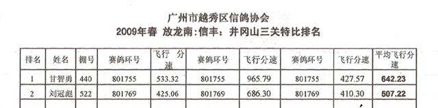 广州市越秀区信鸽协会——09年春放龙南、信丰、井冈山三关特比排名