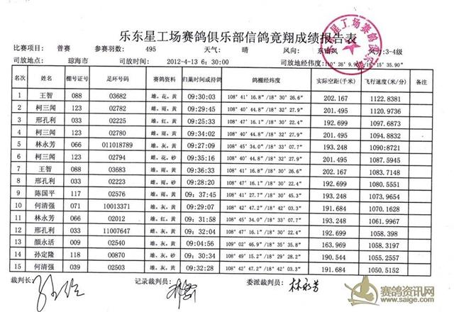 乐东星工场赛鸽俱乐部信鸽竟翔成绩报告表[普赛]1
