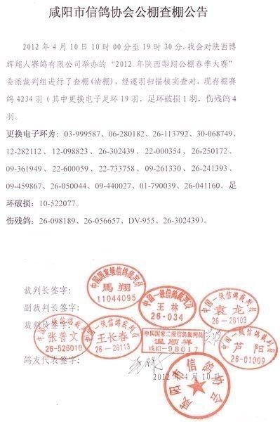 执裁本次大赛查棚工作的咸阳市信鸽协会裁判组 裁判长:马翔(国家级) 副裁判长:王林(一级)、袁龙(一级) 裁判:芦阳、王长春、张普文、温顺祥、吴波、毛鹏 现在时间:4月10日早晨11点