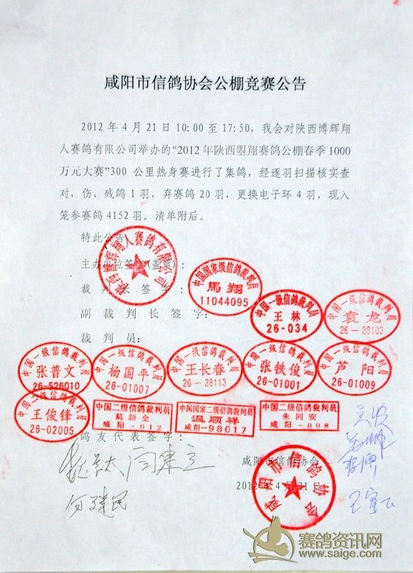 本次比赛监赛的全体裁判员合影 2012年陕西曌翔第三届一千万大赛300公里集鸽 仲裁委 刘文斌、冯建军、马翔、何建民、王林 裁判组 马翔:裁判长(国家级裁判) 王林:副裁判长(国家一级) 袁龙:副裁判长(国家一级) 裁判员(一级) 王长春、张铁俊、芦阳、杨国平、王俊峰 裁判员(二级) 温顺祥、葛新全、朱同安、吴波、冯滨、毛鹏、王宜飞 路监裁判 张普文(一级)、刘宝生(二级) 鸽友代表 魏景太、倪武刚、何建民