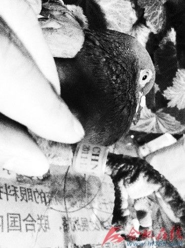 记者发现,鸽子右脚的蓝环上刻有“CHN2011-12;132811”的字样,这应该是信鸽的身份信息。记者随后与合肥市信鸽协会取得电话联系,一位工作人员表示,春季是信鸽比赛的高峰期,这只信鸽可能是在比赛途中遭遇意外迷了路,根据其脚环上的代码显示,这是皖籍的信鸽,但不是合肥地区的。