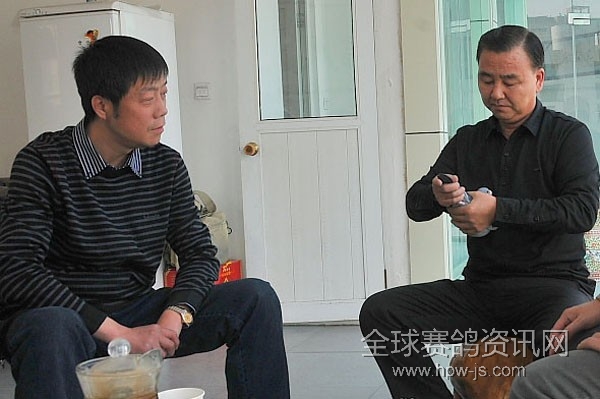 曹二宝(右)欣赏阳光家园公棚获奖鸽,左为阳光家园吴军先生