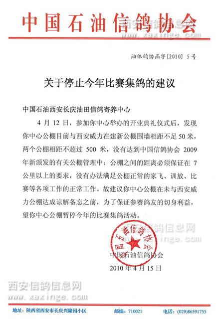 今接到主管单位中国石油信鸽协会通知《关于停止今年比赛集鸽的建议》,我们觉得中国石油信鸽协会从保护参赛会员的切身利益出发的决定是正确的,尽管目前中国石油信鸽协会和长庆油田信鸽协会已投入了200多万元建成这个目前在陕西境内各项设施算得上一流的公棚,但是基于目前我们公棚和威力再建新建公棚相距太近,不符合中国信鸽协会关于相邻公棚间距离7公里的规定要求,目前鸽友反映较为强烈这种实际情况,在我们双方没有达成谅解备忘协议之前,中国石油信鸽协会从保护参赛鸽友切身利益出发,把参赛鸽友的利益放在第一位,同时也从保护2家公棚的自身发展出发,做出这个正确的决定。因此,我们无条件决定坚决执行上级主管单位的这个通知,请已交鸽的鸽友能谅解和支持我们作出的这个决定。
