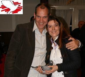 (原鸽主杨.胡曼斯与 96000欧元得標者文斯特拉夫人吉雅Gea,手持天价鸽“百万小姐”)
