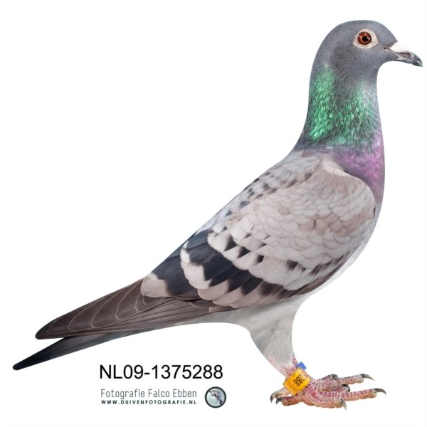 雄鸽是01年的“年轻闪电号”(盖比世界名鸽“闪电号”的直子),雌鸽是05年作出的:“迪克雌”(考夫曼世界名配“小迪克”x“爱神”近亲直女);风靡全球的两大血系荟萃一身!更重要的是这一黄金配对作出数羽超级记录鸽,代表直子“哈利”(Harry)荣获2009年NPO当日归长距离鸽王冠军,中国鸽友通过比利时最大信鸽运输公司老板Kevin Roossesns(凯文·罗森斯)开出200万的高价,被鸽主直接回绝!此拍卖压轴鸽#57号鸽NL09-1375288即是1号鸽的全姐/妹,荷兰两大高手考夫曼和文斯特拉互不相让,最后文斯特拉以96000欧元含税价得标.。幼鸽就是“哈利”(Harry)的全妹!
