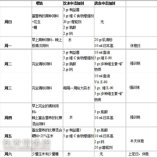 比赛战略部署的第一天,要满足鸽子食物爱好,在食物中添加花生和其他美味的食物并给足食量,甚至此时喂鸽子的水都是甜水的,在水中加大量的碳水化合物和水果。实践证明,因向往这样的美味盛宴,鸽子回家愿望迫切。