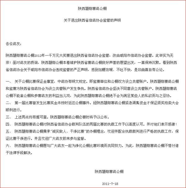 与此同时,引起此事件的起因方陕西瞾翔公棚也在网上公开发表了"关于退出陕西省信鸽协会监管的声明"!瞾翔公棚的说法:陕西曌翔赛鸽公棚退出陕西鸽协监管,改由咸阳市信鸽协会监管,此举实为无奈!