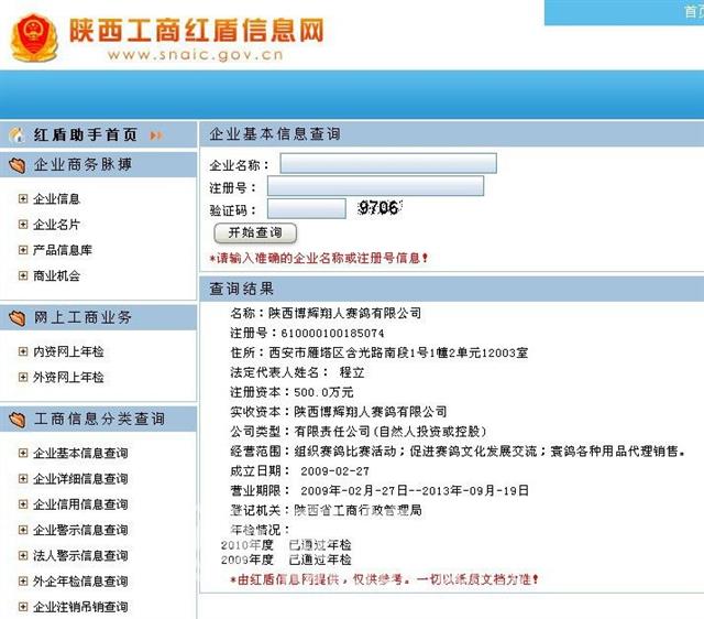 于是我们查阅相关信息,从陕西省体育局的官方网站上我们查到陕西信鸽协会在陕西省省级体育社团的名单列表中。这表明,陕西信鸽协会是省级的体育社会团体组织,是一个独立的社团法人,有独立的民事行为能力。之后,我么又从咸阳市民政局官方网站上查到了"咸阳市民政局(社团)公告",其中列在第52行的就是:咸阳市信鸽协会(咸社证字第2033号)。这表明,咸阳市信鸽协会是咸阳市民政局批准的社会团体组织,是独立的社团法人,有独立的民事行为能力。最后我们通过陕西工商红盾信息网查到了曌翔公棚的所有者--陕西博辉翔人赛鸽有限公司的相关信息,据此可知,陕西博辉翔人赛鸽有限公司是在陕西省工商局登记的企业法人。