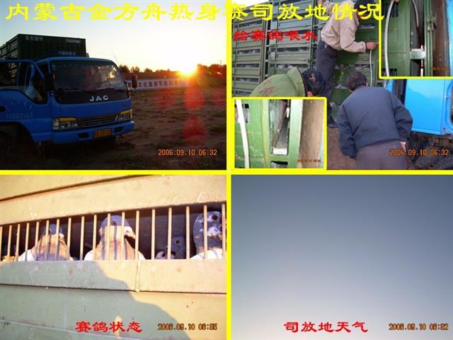 天气状况:晴、无云 风力:微风<3级 风向:西南风 放飞时间:7:30分 放飞地点:杭锦旗 这是放飞完毕后站前记者第一时间采集的报道,训放地天气状况十分良好,十二个字“万里无云、阳光普照、微风轻拂”。俱乐部和裁判人员都齐声叫好,是一个非常适合比赛的难得的好日子,放飞过程十分顺利,在饮水完毕后,太阳逐渐升上了天空,待定向完毕后,于7:30分准备放飞,开笼后盘旋一圈后,这些家伙非常不配合,没等站前记者好好摄像后,像一阵轻烟一溜的飞向了俱乐部的方向,消失在眼前。放飞过程十分顺利,广大鸽友可以放心的等待归巢时候的出现,等待着大奖的来临。呵呵,现在忠心的祝愿广大鸽友可以取得优异的成绩。2006年“金方舟杯”热身赛司放结束。相关报道我们会在第一时间上网与广大鸽友见面,请广大鸽友随时关注网站动态。