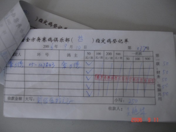 2006年9月10日上午,呼和浩特市上空万里无云,微风习习,是一个难得的赛鸽竞翔日。内蒙古金方舟赛鸽俱乐部公棚所在地车水马龙,人头攒动,一派热闹的景象。一大早呼市鸽友就来到了公棚,迫不及待地进行指定鸽。 索力德鸽舍的鸽主,对自己的赛鸽的实力充满自信,将交俱乐部的30羽赛鸽全部进行了指定,并按要求填写了“指定鸽登记单”,交纳了指定款后离开了指定鸽受理处。 俱乐部的工作人员进行复核时发现,索力德指定鸽037号登记单上,只填写了一羽指定鸽的环号,却在50元指定款的栏目中打了5个√,并交纳了相应的250元指定款。由于其中的四个栏目中并未填写环号,这样索力德实际在该指定单中只指定了一羽爱鸽,却交纳了5羽指定鸽款,多收了200元指定款。发现问题后,俱乐部财务人员立即用电话通知了索力德鸽舍,接到俱乐部的电话后,索力德鸽舍的主人感到十分惊讶,因为他交完款后也未核对指定鸽的登记单,没有察觉到多交的200元指定款,通过俱乐部工作人员的解释,索力德鸽舍的鸽主对金方舟俱乐部的认真负责的工作态度,科学严谨的工作作风表示了高度的赞扬。
