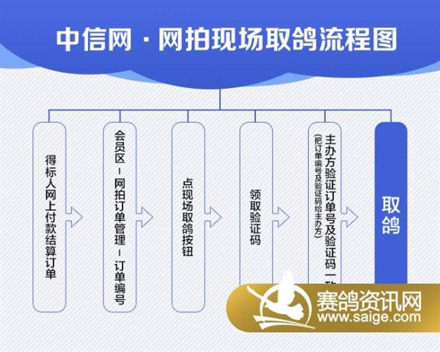 现场取鸽(推荐):1、登录会员区结算订单;2、查看订单编号,点现场取鸽按钮,获取订单取鸽验证码,系统会自动发送手机短信到拍卖会员指定手机;3、把验证码报给公棚工作人员,验证成功;4、交接拍卖鸽,签收发放取鸽凭证。→现场取鸽详细流程