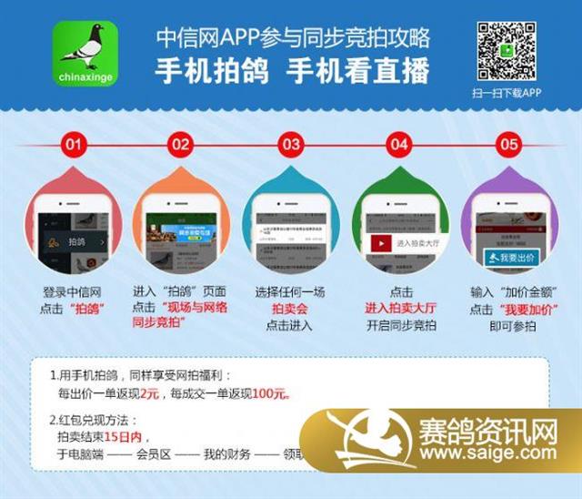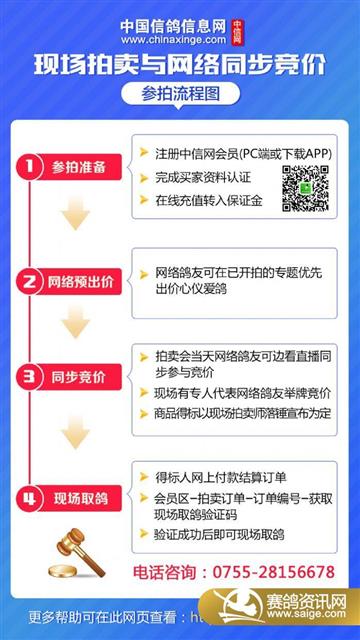 为了让全国各地的鸽友更便捷地参加本公棚秋季获奖鸽的拍卖,本公棚与中信网合作推出“现场与网络同步拍卖服务”,无法前往拍卖会现场的鸽友,可使用电脑或手机登录中信网,观看现场视频直播,并与现场鸽友同步出价,享受足不出户参与竞拍的便利!