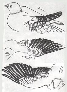 讨论暂进入佳境,在开始论议速度鸽的羽翼之前,先探讨该用何种角度来观察主翼,而在叙述筋肉的肉质之前,又应该先注意何处的筋肉呢?冠军男子汉柴崎先生过去研究十余年的成果大公开。 问10.(续上集)请说明有速度的主翼该如何判别呢? 柴崎:速度鸽本鸽舍有布列伊.达克斯与布尔圣巴桑等,在一千公里赛以一千五百公尺以上的分速获胜,实际观看其主翼,加以说明,展开主翼首先看到的,请注意其主翼一支 一支的形状,尤其先端的五支,其特征很明显,羽轴的弯度又很锐,羽轴的内侧对比外侧的幅度较为狭小?至八、九、十更明显(参照插绘),展开主翼时,不必看其平面,本人更加认为做立体的观察,由上往下看去,不如看横的或稍斜上看去时更能了解,博羽的构造是如何?外五支均极端向外伸出,相互间有间之殷差,如合叠在一起就无法切风,由第一关节开始,内侧是完全不动的,只柔动外侧,继续回转前进,(参照插绘中)速度鸽主翼的形状免展开主翼,在鸽子停立收羽时就能简单的判定出来,主翼全体顺其流线,收在一起时,每其一支一支大幅偏出,其偏出的角度愈大愈有速度,观察其偏出的大小,再展开主翼,更明了,同时了解破风的角度,(参照插绘上),用口头是无法说明清楚,鸟类主翼的形状与飞机翼是完全相同的"如何来切风(破风)取得浮力与推进力(参照本页相片)。 问11,欲想研究尾飘与主翼,该采取何种具体的方法呢? 柴崎:请教鸟类学者或兽医师比较妥当。本人自始不烦用以(专人)外行判断,换羽期主翼一支一支拔落将全部收集加以比较对照,由先端的第一支、第二支、第三支,每支均不相像,由这边来研究主翼是不是恰好,用肉眼观察尾羽其构成较粗糙,而主翼比较精细,羽毛的黏合也复杂,因使用频度愈高,自然其重要部位就变成这样。 问12.请问有关尾羽的问题,在新泻春西线赛飞出相当的分逮,而经捉拿近、中距离程度的优胜鸽时,展开其尾羽,并未感觉到有何影响,而捉拿长距离优胜鸽时,就感觉到腰部相当结实,关于尾羽、腰部等主要重点在何处? 问13.本人想了解关于腰部的情形,有何种腰部的鸽子才能在比赛上强出头呢? 柴崎:本人认为腰的坚强,决定在骨骼的构成,因此捉拿时腰会滚动,尾羽会展开的鸽子,在骨骼上的构成有缺点,反之有结实缔束的腰,捉拿时,不会滚动身体,严格地说,比赛参加羽数,如数百羽或千羽左右,优胜的鸽子中,捉拿时结果会出现滚动腰与尾羽展开的鸽子,但是万羽以上的比赛优胜就无此现象,腰是相当重要,有结实的腰就牵连筋肉的问题。 问14.关于筋肉的问题不了解的部份实在太多了,常说筋肉要有弹性,由何方面来观察判断呢? 柴崎:有人捉摸胸部而说筋肉太软,或富有弹力性等,本人持有相当的疑问?胸肉与筋肉 完全不同,胸肉是近朱红的赤色,相对筋肉是稍有白色的才对,麦加比赛的人应该知道的,鸽子飞回来疲劳时其胸肉会消落,筋肉不消落才对的,如果筋肉消落,不但不能飞翔,连走动都不可能,附有筋肉的部份应该是自肩脾经背中心而至腰部的部份(参照本页插图),特别重要的是肩脾的筋肉,其次是胸部内侧的筋肉,以鸡来说是筋膜,筋膜的连接部份全部集中羽翼的每支羽的接着处,反之来说,自腰部经背中心的筋肉连接在羽翼的接根处,以鸡为例,杀后容易取出胸肉而最后筋膜残留下来,即意味着胸肉是保护筋膜的,比赛疲劳消耗了热量时,胸肉有补充作用,如说筋肉消落是完全的误解,曾提出腰部的问题,有结实的骨骼构成,且加上自背至腰部的筋肉如紧接缔束时,决不会展开尾羽,由此重视筋肉的问题,自肩的筋肉羽翼的接根处至背中心、腰等筋肉以及硬软的程度等应详细观察才是的。 问15.经锻练其筋肉后,立姿是否会变? 柴山奇:经观察最近导入的冠军,一见背部稍圆圆的,为何如此,是强制加以训练使其背部的筋肉发达,一看认为弯背的,开始立姿的问题,东京的吉田直纪先生(翔道6段)听说有很趣味的话,吉田先生(翔道6段)舍内的选手鸽,稍向后的鸽子很多,加以强制舍外训练下前向的鸽子会挺立起来的,为何变成如此详细情形可请教吉田先生。 问16.开始参加比寨,任何人都期待优胜,为此必需有中间训练,不知是否有更好的方法? 柴崎:本人对训练不十分热心,应该由外人来回答较妥当,例如自己期待的比赛,像东日本的冠军赛等,集鸽的一星期前,训练二次,训练的目的也有二项,第一使其认识回巢,再一项是调整身体的条件,曾在爱鵰之友说过,鸟类有"砂囊 ",有人说是「粪袋」放飞瞬间,急欲回巢是不是因紧张,一定会放粪,这是绝对性的,因此鸽子比赛回巢时不例外放出绿便,"砂囊 "?堶控?X得空无一物,所以判定距离飞回来时砂囊已空空,使之饿肚回来再给新鲜的饲料,因此调整上升身体的条件与认识回巢,无论两方都很重要,每回的中间训练都要如此,结果的好、坏,本人对比赛非强手,不敢肯定的说,你如何采取使用,以上只为提供参考而已。 问17.今天参观柴崎鸽舍为数不少的冠军,令人吃惊的是,只只都是如此的美丽,是不是冠军鸽都是如此呢! 柴崎:生物强壮高速度都很美丽,动物全是如此,优良的都是很美丽,但只看得很美丽是不够的,持有锐美,精悍健康才是真正的美丽。 问18.鸽子能活到几岁呢? 柴崎:大约有活到廿岁左右,也有命短的,是不一定的,再这一只「达伊亚」73年圣巴桑国际赛优胜时五岁,雌鸽今年17岁,还能自已育出仔鸽,又去年获得国际赛优胜,最近所导入的此羽冠军
