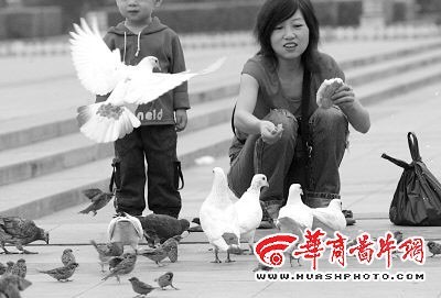 鸽子与麻雀和睦相处 本报记者 王鹏 摄 本报讯(实 习记者 解晨红)白白的大鸽子,小小的褐色麻雀,一看到人们送来吃的,马上就一起挤了过去。鸽子们个个争先恐后,麻雀也不甘示弱,它们你来我往相处得倒也其乐融融。 昨日上午10时,韦女士带着自己两岁的儿子来到西安市新城广场给广场鸽喂食。她将准备好的面包屑撒在地上,成群结队的鸽子们一下子围上来抢食。 谁知此时一群小麻雀也赶紧凑了过去,并利用自己的身材优势,在鸽子中间灵巧地跳来跳去。大家你一口、我一口,吃得是不亦乐乎。 一只胖乎乎的鸽子正高兴地吃着,忽然嘴下一滑,掉了!只见一个娇小的身影快速冲过去,轻轻一啄,到嘴了。占了便宜的麻雀扭头就溜,胖鸽子只好再去找吃的。 孩子和大人们只顾着喂鸽子,对抢食的麻雀们也毫不介意,反正有很多吃的,给它们也来上一些吧! “这些麻雀出现在广场上已经有一年多时间了,只要有人来喂鸽子,麻雀们绝不嘴软,定要与鸽子们一起分享呢!”管理这些鸽子的潘师傅说。 据潘师傅介绍,这些家伙们极其“敬业”,与鸽子们一起“上下班”。清晨鸽子们刚出自己的“家”门来到广场,麻雀们一定会赶来和鸽子家族汇合。饱食一天后,鸽子们“下班”回“家”,它们也齐刷刷地飞回树丛中的“家”。