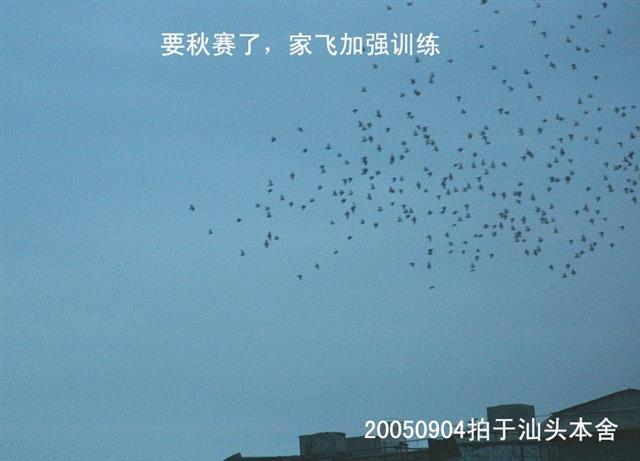 9月5日下午5点30分我一下班,就马不停蹄直奔6楼天台鸽棚,把全棚的的鸽子"赶出家门"进行为时一个小时的家飞训练.不用片刻功夫,近百鸽子就飞上了高空......还不到十分钟,有一小群好吃懒做的家伙突然低飞想下来吃饭.嘿嘿!好在我早有了准备--口哨加彩旗!这一招是在"海霸王家飞训练"偷师学来的,还真管用,他们又乖乖地飞上高空和大部队汇合了.没有一个小时你们休想下来。因为我深信,只有训练有素并有优良血统赛鸽才有可能在强手如林的汕头赛场上出人头地,我们一起加油吧,哥(鸽)们!