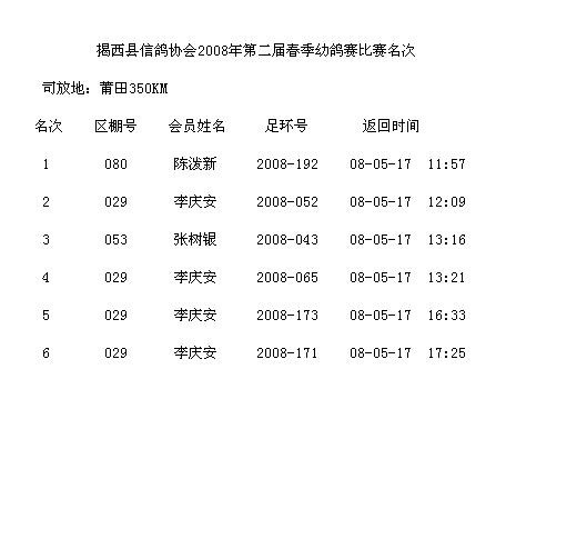 2008年揭西县信鸽协会第二届春季幼鸽赛成绩