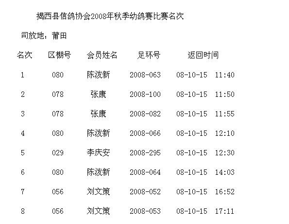 2008年揭西县信鸽协会秋季莆田幼鸽赛成绩
