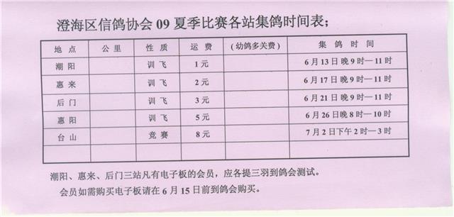 澄海信鸽协会09夏季比赛各站集鸽通知