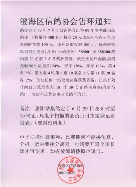 澄海信鸽协会售环及惠阳集鸽通知