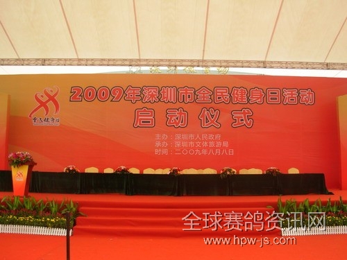2009年8月8日由深圳市政府主办,市文体旅游局承办的“全民健身日”活动中,深圳鸽会积极参加本次活动。并且在活动中投入了一定的人力和物力。在广场展览区有协会自己的展厅。向广大市民宣传信鸽事业的历史,赛鸽运动的意义,深圳鸽会的成长和未来。展厅精美的设计,工作人员的精彩讲解得到参观市民的赞赏。 深圳鸽会义务为“全民健身日”活动启动仪式投放1000羽彩鸽,成为活动仪式上的亮点,它将永远载入深圳市“全民健身日”活动的史册。 深圳鸽友之家徐新春2009-8-10