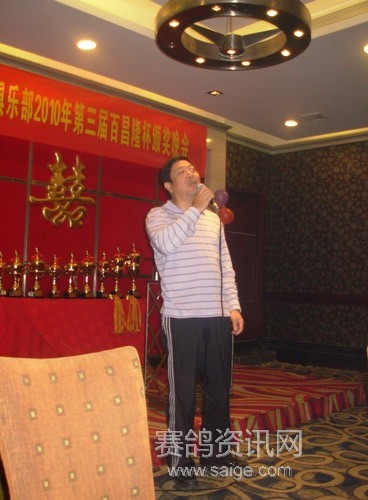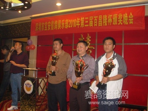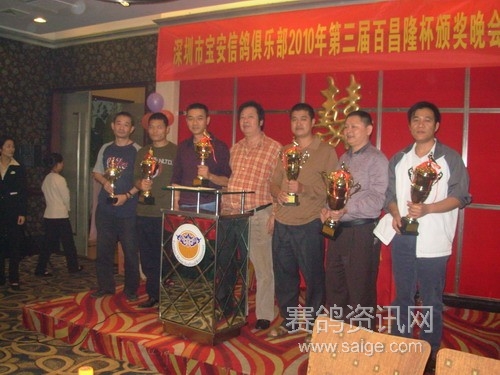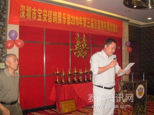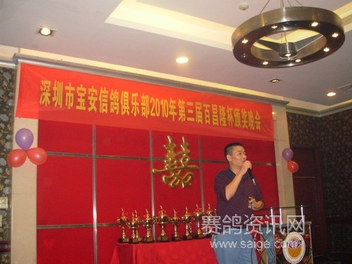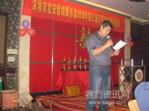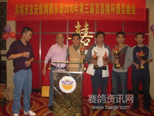 深圳宝安信鸽俱乐部颁奖会(图) 前日晚深圳宝安信鸽俱乐部第三届2010年秋季百昌隆杯颁奖会在和谐友好的气氛中召开。深圳市信鸽协会5名常委应邀出席颁奖会分别为获奖的会员颁奖祝贺。宝安俱乐部近几年信鸽活动开展红红火火,会员玩得开心,参赛成绩在市协会、公棚年年攀升。在此预祝宝安俱乐部的朋友们明年更比今年强。 深圳徐新春 2010-11-16