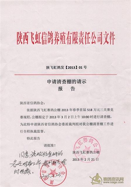 陕西飞虹赛鸽公棚查棚公告