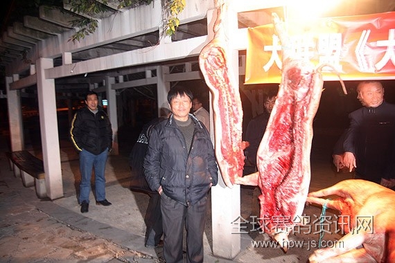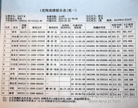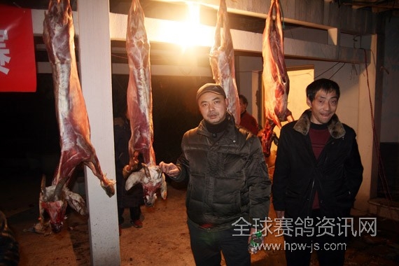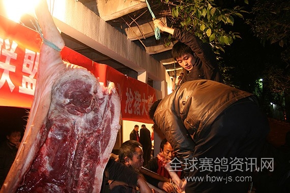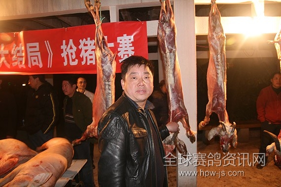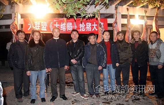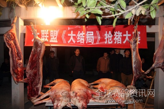 重庆赛鸽大联盟“大结局”抢猪赛于2010年1月24日在四川南部县举行。本次比赛参赛集鸽羽数是:50元/每羽,356羽;100元/每羽,213羽;300元/每羽,52羽;组鸽39组。为了体现公平,赛事由重庆巴南区罗虎全、廖福祥和大渡口陈正强鸽友参加现场司放。于2010年1月24日上午9点正准时开笼,司放座标:E106°03'345";N31°21'548",天气阴无雨。空距200km。由于天气原因归巢率不太高。有效期报到14羽,前10位鸽友分别获得了重庆赛鸽大联盟颁发的猪、羊;60位分别获得猪蹄和板鸭……请欣赏“抢猪”图。