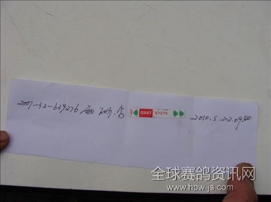 2010年春季重庆市铁路信鸽协会,1000公里火车头千公里统放,于2010年5月15日集鸽,5月19日6时20分在甘肃武威放出。历时3天阴雨天气,2010年5月22日重庆天气终于放晴,垫江分会乡村会员谭春的一羽足环为 2007-32-639276的雨点砂眼雄鸽,早上归巢了。由于家在乡村,没有鸽钟,本人也没有打电话,今天赶县城,于是持鸽步行3公里路,于2010年5月22日10时 在俱乐部找到了报到人。报到后,由鸽会电话向重庆铁路信鸽协会报到,重庆报到时间是:2010年5月22日10时12分。本网记者现场拍下了报到现场和赛鸽,这羽赛鸽2009年获得甘肃兰州700公里亚军,2次陕西省凤县400公里归巢,1次四川万源250公里特比环获奖。重庆今年春季在恶劣气候威胁下,800公里兰州国家赛有效期第3天700公里报到24羽、800公里报到一羽的情况下,重庆铁路系统组织了700、800、1000公里通讯赛。这羽(国系吴淞)不负重庆鸽友重望,战恶劣气候,归巢获得总冠军。22日15时10分长寿分会,唐庭维鸽友的一羽足环为2007-31-199761的灰黄眼雄鸽,归巢报到,该鸽获重庆市千公里亚军(长寿区分会冠军)。22日15时32分机关鸽会,王远进鸽友的一羽足环为2007-31-352153的深羽黄眼雄鸽获得季军(机关鸽会冠军)。向上述鸽友表示祝贺,祝贺明日更多赛鸽归巢……