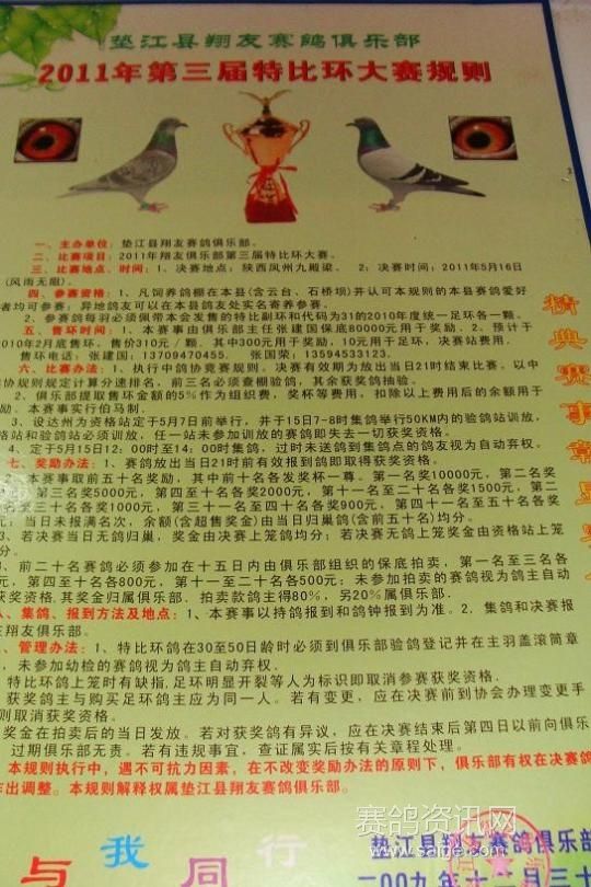 垫江县位于重庆市域中部三峡库区生态经济区,距主城区120公里,幅员面积1518平方公里,辖25个乡镇. 重庆直辖以来特别是“十五”时期,确立了“建设渝东经济强县、实现富民升位、全面建设小康社会”的奋斗目标。2009年末的统计表明,全县总人口94.22万人,在这94万人口的小县,养鸽人在200人左右,养鸽羽数在3万羽以上,其中养赛鸽的在2万羽左右。两个信鸽协会(地方县信鸽协会、火车头行业信鸽协会),一个赛鸽俱乐部—重庆市垫江县翔友赛鸽俱乐部。翔友赛鸽俱乐部成功举办了两届400空距的特比环QQ汽车大奖赛条件下,应鸽友要求,二〇一一年改为第三届10万元300元/枚特比环大奖赛(见规则)。每年“5.16”鸽友摩拳擦掌,信心十足,盼望自己能夺冠摘银。通过今天下午验鸽,二〇一一年五月十四日夜间20~22时,在重庆市垫江翔友赛鸽俱乐部集鸽了。铁水桥畔集鸽忙,现场十分火爆,集鸽裁判严格验鸽,一丝不苟。发现参赛鸽异常,马上取消资格。