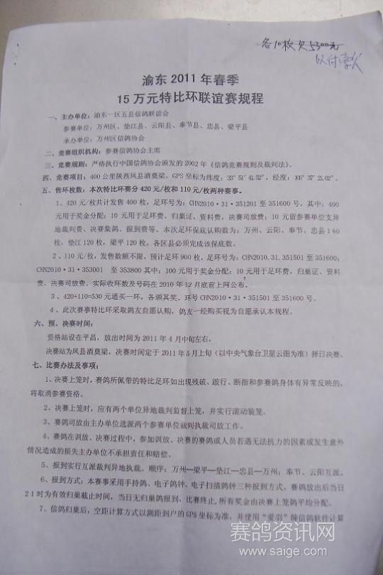 2011年5月15日下午,渝东一区五县部分鸽友汇聚万州。在太白岩下的重庆市万州区信鸽协会,重庆市万州区天源赛鸽俱乐部茶园,举行渝东2011年春季15万元特比环联谊赛颁奖拍卖会。太白岩下,大榕树旁杯杯茶韵,获奖鸽友侃谈鸽经和喜悦,有些鸽友道出悲哀和心酸。