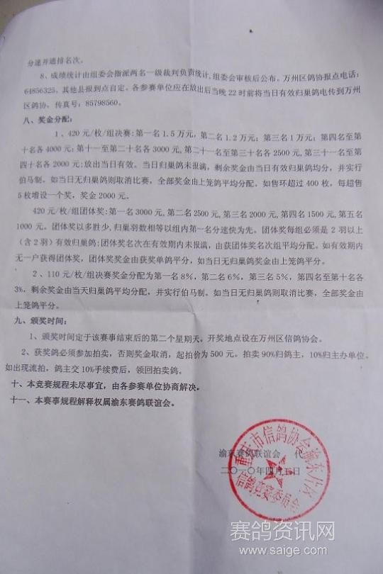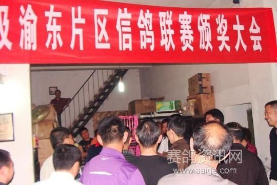 15时联赛颁奖大会开始,由东道主万州区信鸽协会负责人主持会议,对各参赛兄弟协会鸽友的到来表示热烈地欢迎。渝东片区竞翔委员会副主任,梁平县信鸽协会主席—尹登华到会祝词。垫江县信鸽协会主席—刘天成参加了大会。(渝东片区竞翔委员会主任—黄焰,有事没有到场)。会议总结了比赛过程中的经验,找出了联赛工作中的教训。公布了比赛成绩,并现场颁奖。按照规程,对12羽优秀归巢鸽进行了拍卖,最高鸽拍卖价格为4000元,最低1000元(主要是山区经济问题,拍卖不起价格)。希望全国鸽友喜欢山区赛鸽的,今后多多加以关注。