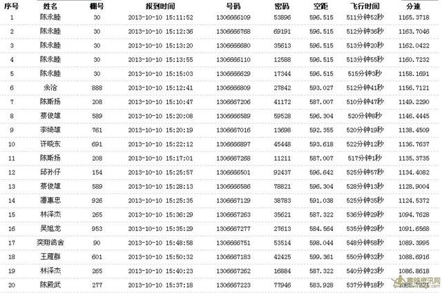 2013年10月10号汕头奋翔信鸽俱乐部 秋 平阳决赛
